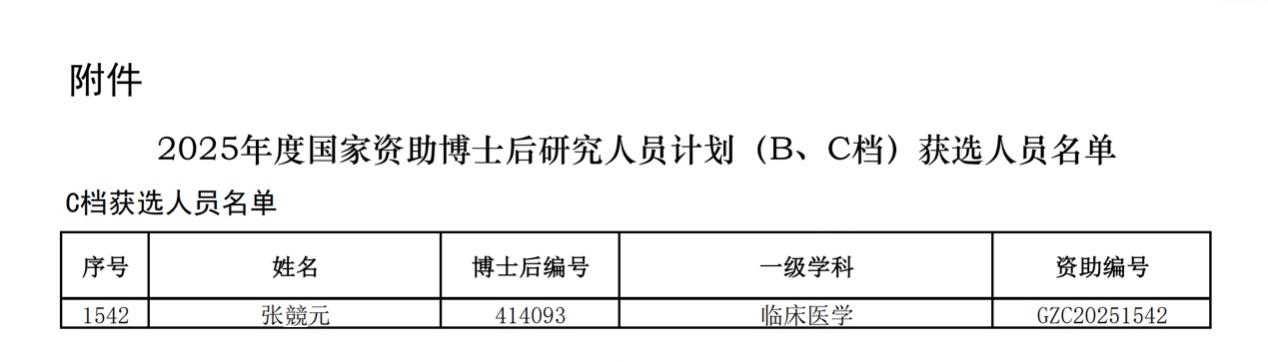 近日,全国博士后管委会办公室、中国博士后科学基金会公布了2025年度国家资助博士后研究人员计划(B、C档)评选结果,确定了博士后国资计划(B、C档)获选人员3844名,其中临床医学B档85人,C档270人。beat365官网劳动卫生与环境卫生学教研室博士后张競元获批“国资计划”C档资助。“国资计划” C档资助标准为每人每年12万元。资助期为2年,标志着beat365官网在高层次青年人才培养体系建设上迈入新阶段。