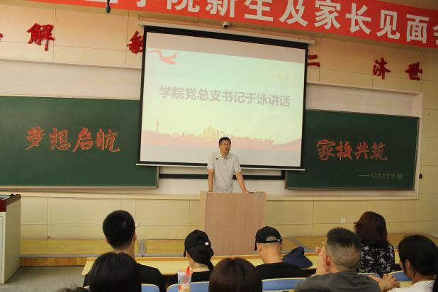 会议首项议程为学院党总支书记于泳发表讲话。他对新生及家长的到来表示热烈的欢迎,同时,对同学们提出了几点要求:第一,要志存高远,树立远大而崇高的理想,让梦想成为照亮前行道路的明灯;第二,要勤奋学习,广泛涉猎,不断提升自我,为未来的挑战奠定坚实的基础;第三,要勇于实践,敢于担当,在实践中锻炼能力,增长才干,成为社会的有用之才;第四,要修身立德,注重个人品德修养,树立正确的道德观念和价值取向。最后,于泳书记向新生家长传达了家校合力共同促进学生成长成才的愿景,并希望同学们都能成为德智体美劳全面发展的新时代青年。
