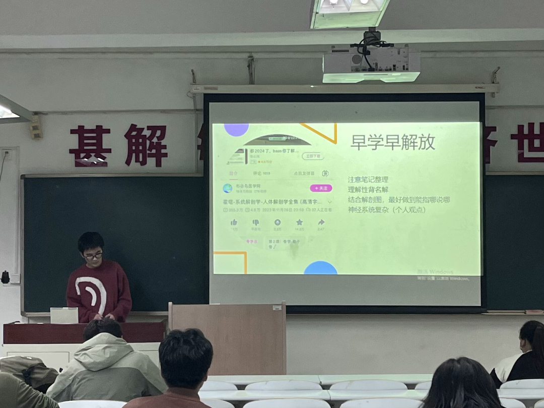 23级单科成绩优秀的同学从自身经历出发,分别对大学英语,医用基础化学,系统解剖学,管理学基础等学科进行详细地讲解与合理地规划,同时鼓励同学们将所学的知识运用到实际学习中,不断探索适合自己的学习方法。在交流会上,学长学姐们倾囊相授,总结和分享他们的学习方法,最后希望同学们拥有永不言弃的信念,奋勇向前,期末高过。
