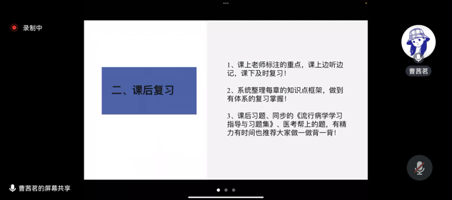 此次分享在线上进行,21级单科成绩优秀学生代表为22级的同学们就临床诊断学、毒理学基础、社会医学、卫生化学、医学心理学等学科的课堂重点和课后复习进行了细致的剖析与阐释,分享了预习重点和做笔记的技巧,激发了同学们对知识的探索,促使同学们构建自己的知识网络。同时希望同学们能够将所学的方法运用到日常学习中,积极复习,精心备考。
