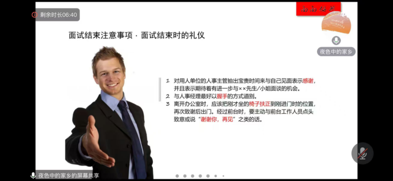 为提升学生求职竞争力,帮助学生更好地掌握面试技巧,beat365官方网站中文于10月23日在腾讯会议线上举办了一场面试技巧指导讲座。讲座特邀来自锦州何氏眼科医院的人力资源部主任牟海力老师担任主讲。牟老师长期从事人力资源管理,经验丰富,对当前的就业形势和面试技巧有着深入的研究和独到的见解。两位辅导员老师老师及全体毕业年级学生参加了此次会议。