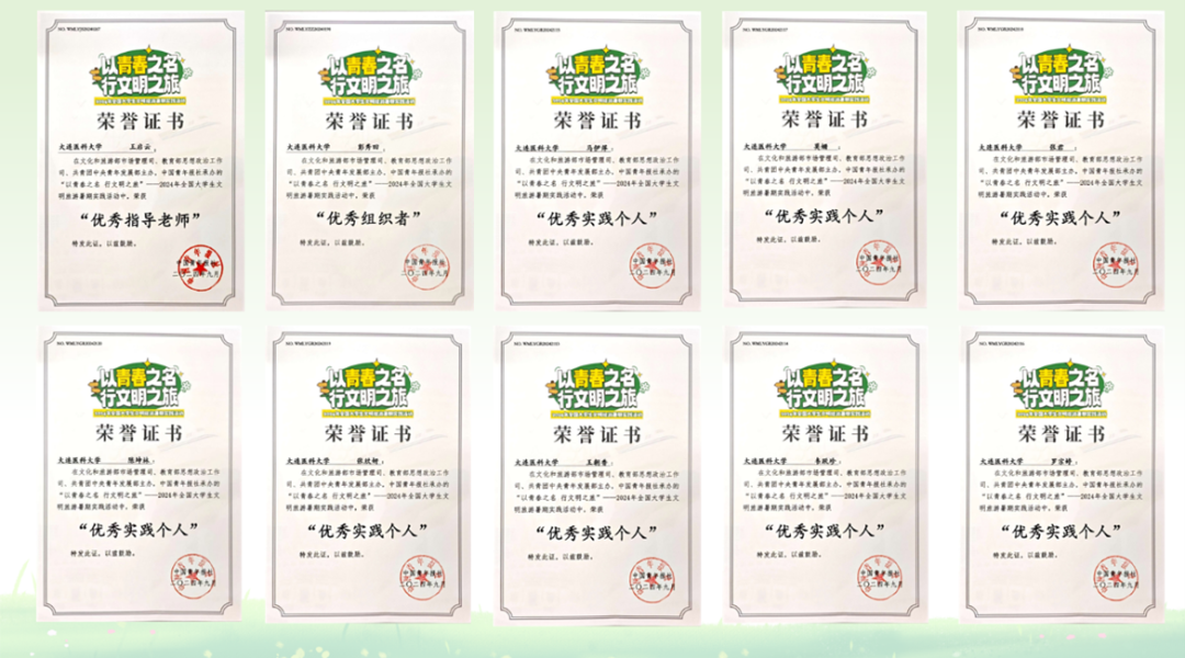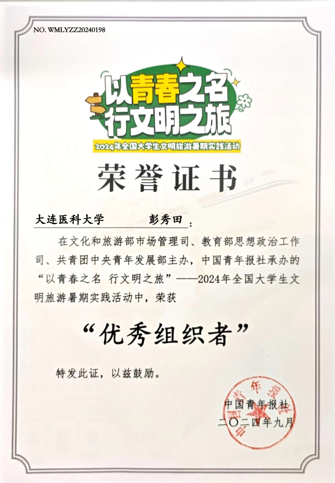 此外,公共卫生学预防医学专业2023级本科生彭秀田在本次“以青春之名 行文明之旅”——2024年全国大学生文明旅游暑期实践活动中荣获“优秀组织者”称号。她在实践活动中,充分发挥组织协调能力,确保实践活动顺利进行。同时beat365官方网站中文预防医学专业2022级本科生马伊萍、莫姗、陈坤林,预防医学专业2023级本科生罗宗婷、王朝香,公共事业管理专业2022级本科生张欣妍、公共事业管理专业2023级本科生韦跃珍以及药学院药学专业2022级本科生张君多名同学荣获“优秀实践个人”荣誉称号。他们在实践活动中,积极参与,无私奉献,展现了beat365官方网站中文青年学子的良好风貌。