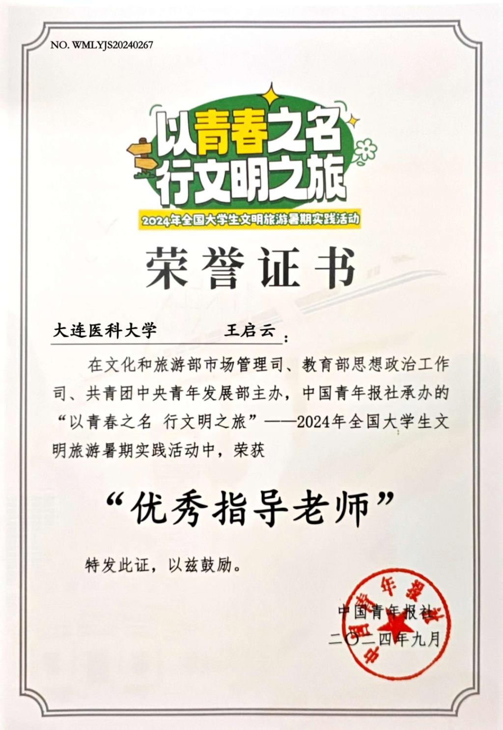学院王启云老师在本次“以青春之名 行文明之旅”——2024年全国大学生文明旅游暑期实践活动中荣获“优秀指导老师”称号。她在实践活动过程中,认真负责,悉心指导,为实践团提供了宝贵意见和有力支持。