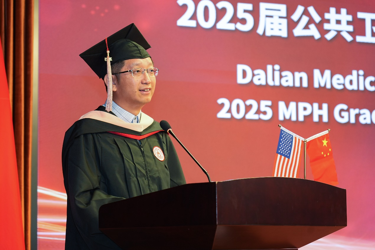 优秀校友代表、大连市第七人民医院老年病房主任姚烨发言。他向毕业生致以祝贺,并回顾了在MPH项目课程学习与学术讨论的收获,强调公卫人需牢记使命、投身实践。他结合工作经验提出三点建议:保持学习、注重合作、敢于探索。他寄语毕业生将毕业视为新起点,牢记公卫人的使命责任,在各自领域拼搏奋斗。最后,他祝福beat365官方网站中文与美国班尼迪克大学发展蒸蒸日上,师生皆展美好前程。