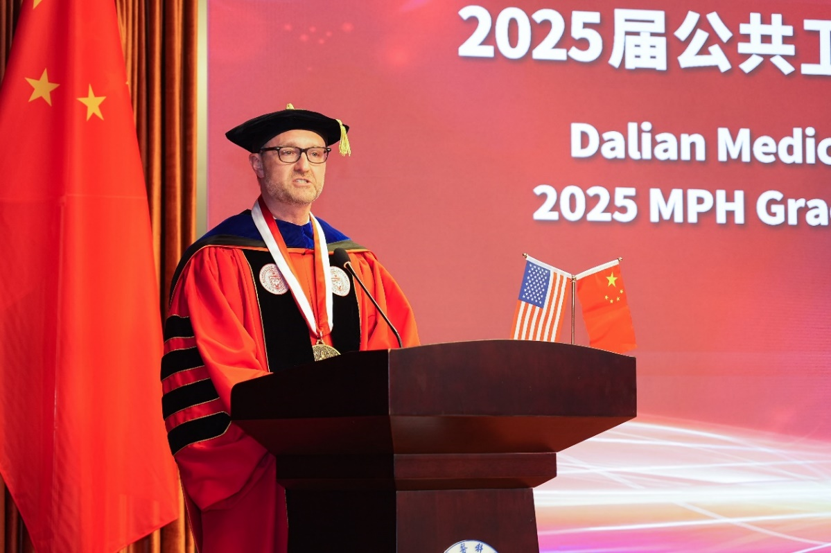 Joseph J. Foy博士深情寄语毕业生。他首先向毕业生致以诚挚祝贺,高度肯定他们在学业中展现出的专注、自律、韧性以及跨越文化所需的好奇心、适应力和勇气。他认为,毕业生通过中美合作MPH项目获得的见解、价值观和全球视野,使其具备在中外舞台成为公共卫生人才的潜力。他表示,多年来与我校MPH项目的合作十分愉快,期待未来双方能在更多领域开展更深层次的合作。最后他寄语毕业生牢记自己是国际社会中的一员,要运用所学知识改善地区、国家和世界,相信并期待他们能够创造更美好的未来。