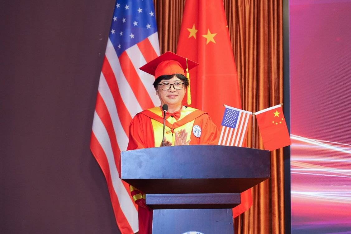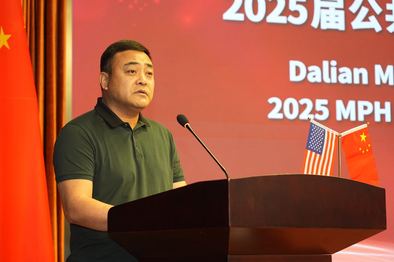 邵淑娟首先致辞。她向毕业生表示热烈祝贺,向中美教师团队、支持项目发展的各界朋友致以敬意和感谢。她强调公共卫生事业在全世界的重要性,希望毕业生牢记初心使命,以“健康所系、性命相托”的信念践行公卫人的责任担当,为中外公共卫生事业贡献自己的“中国智慧”。最后以“志在青云,行在实地”“学无止境,进无终途”“饮水思源,铁肩担义”三句话与毕业生共勉,期望他们将个人成长与国家发展结合,保持终身学习,感恩担当,并欢迎毕业生常回母校,祝愿他们前程似锦,在公共卫生领域绽放光彩。